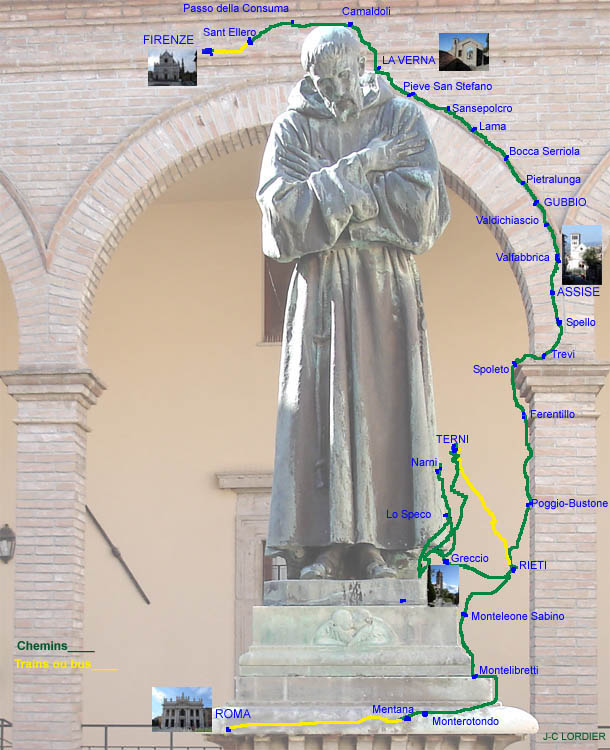 En 2006 j'ai marché à pied du Puy en Velay à Rome ; avant de quitter la Città Etternà, il m'était venu l'idée "de faire un aller retour en train" à Assise en un jour ou deux! Pourquoi là et pas ailleurs? Je ne sais pas... d'autant que je ne connaissais pas grand chose d'Assise et de St François, à part ce dont j'avais entendu parler. Finalement j'ai renoncé à Assise à ce moment là, en me disant que je reviendrai bien en Italie une autre fois, et cette ville méritait mieux qu'un aller-retour. Le premier Appel venait de se manifester sans que je m'en aperçoive! Dans le courant de l'année 2008, en cherchant sur internet des Sanctuaires en France et en Europe, un lien me menait à Assise avec un tour operator proposant des séjours touristiques... mais après plusieurs clics je m'aperçu "Ô Bonheur" qu'il existait un chemin de (l'Alverne) La Verna à Assise pour bons marcheurs! Mais qu'est-ce donc La Verna? Où est-ce?... Je devais approfondir mes recherches. Autre signe Providentiel : la découverte d'un chemin de pèlerinage. Quelques temps après, j'allais à Lourdes pour une semaine, et dans l'armoire bibliothèque du foyer où j'étais logé, le premier livre que je saisis sans le faire exprès, est sur la vie de St François d'Assise... Je dévore les cent cinquante ou deux cent pages! Désormais j'en sais un peu plus. Autre signe Providentiel : j'apprends à connaître San Francesco di Assisi. Dans une librairie à Paris, je trouve le topo guide dont j'avais entendu parler : "Sur le chemin de Rome", et j'apprends que St François a parcouru plusieurs fois le chemin de Florence à Assise, et Rome. A ce moment là, je me suis dit que mon départ serait aussi à Florence, même s'il nécessiterait près de quatre semaines de marche. Nouveau signe ou appel? Certainement : tout cela n'arrive pas par hasard. Dès lors, je n'attendais pas seulement les "effets Providentiels", je les provoquais! (Aide toi le Ciel t'aidera.) Questions, réponses, attentes parfois, idées qui viennent (toutes seules?) Le senti et le ressenti!