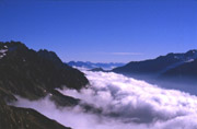 La brume descend de plus en plus, et lorsque je mets le nez dehors, je n’y vois plus rien ! Cependant, en remontant le Val le jour se lève, et arrivé à la fenêtre d’Arpette, le bleu du ciel est au dessus de moi, et une mer de nuages sous mes pieds !