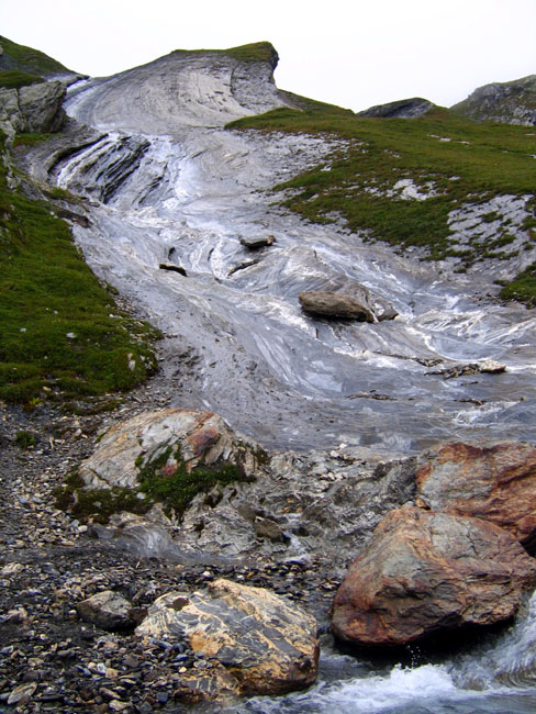 Dans le vallon des Fours, le torrent des Tufs coule sur la roche usée et polie, en épousant les formes et les contours.