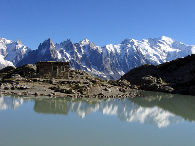 Le Lac Blanc, les Aiguilles de Chamonix, et le Mont Blanc.