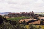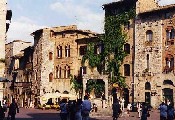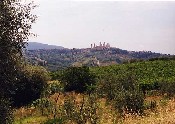 Arrivé à Poggibonsi : gros bourg, c'est presque la ville. Les routes, les rues dans tous les sens, les voitures, etc... Pour rejoindre l'autre extrémité sans s'égarer, c'est une gageure! Une pause dans un bistrot pour boire une très grande bouteille d'eau minérale de deux litres. On m'indique une route à suivre. La circulation est très importante, et les italiens conduisent comme des cinglés. A proximité de la propriété Pietrafitta je laisse cette strada dangereuse, pour suivre une route à droite beaucoup moins fréquentée. San Gimignano se détache au loin sur une colline, et ses tours médiévales font une drôle d'impression! A distance, on croit voir des grands immeubles de banlieue!...Il n'en est rien fort heureusement : le village est un joyau. La Piazza della Cisterna construite en 1273 : de forme triangulaire, au centre du village, elle est bordée de maisons tours médiévales. La Piazza del Duomo : centre monumental de San Gimignano. La Collégiale et Basilique Santa Maria Assunta : construction romane du XIIe siècle. Le Musée d'Art Sacré, et le Musée Etrusque. L'Eglise romane San Agostino. La Rocca di Montestaffoli : forteresse de 1353, et sa vue panoramique sur la ville et la campagne. |