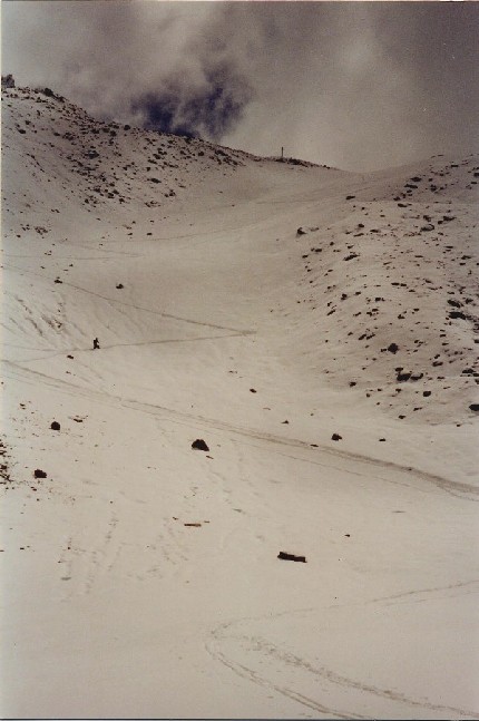 A partir d’ici la neige est présente. La montée est pénible : on s’enfonce, et la pente est raide. Comme par hasard, le ciel se dégage, et le soleil chauffe : « on l’avait oublié ».