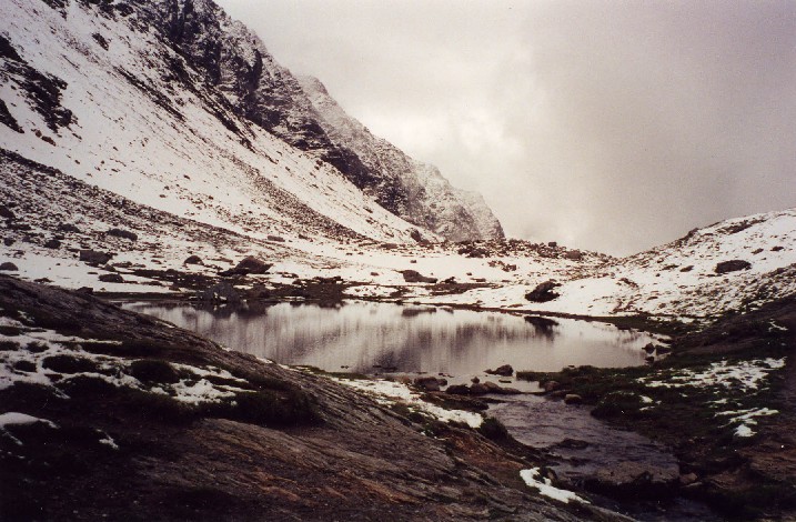 Donc au lieu de rejoindre le refuge de Turia, et la vallée de Ste Foy, je repars comme je suis monté, en m’adonnant à mon plaisir favori : courir dans les névés, en plantant bien les talons ! Il me faut dix minutes pour retourner au lac des Moutons : j’avais mis une heure pour monter !