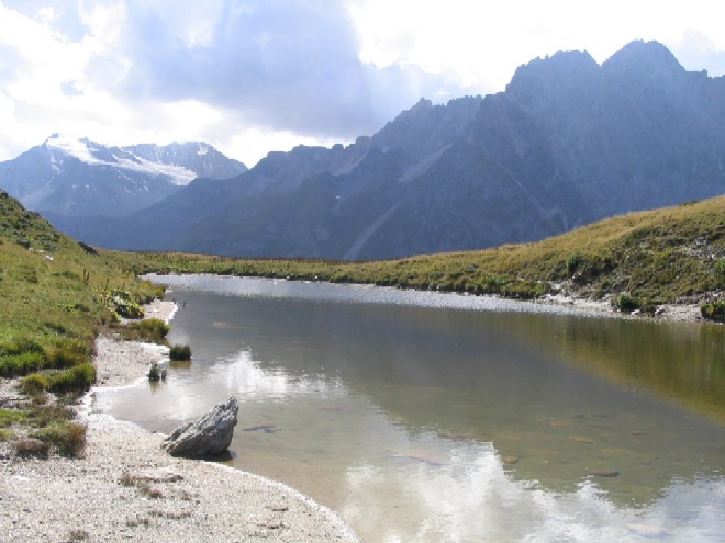 Un étang le long du sentier balcon, et en arrière plan, toujours Péclet Polset et le glacier de Gébroulaz.