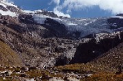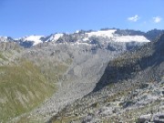 Il faut redescendre une pente extrêmement abrupte dans les cailloux, jusqu'au cirque du Dard, dominé par sa Pointe et son glacier suspendu.