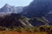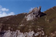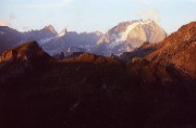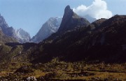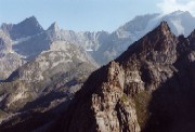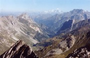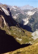 Nous continuons par un chemin à peu près horizontal au chalet de la Loza, et faisons une pause casse croûte un peu plus loin. Toujours la vallée au bas, et de l'autre côté, le roc des Corneilles, se dresse comme un monolithe. En face de nous, au loin : l'Oisans, la Barre des Ecrins, et la Meije sont parfaitement visibles. |