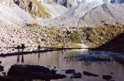 Nous passons devant les chalets de la Glière, et après avoir traversé un torrent, et suivi plusieurs lacets, nous arrivons au lac des vaches où tout un troupeau déambule. Ce lac sans fond avec des pierres plates pour le traverser, est encore à mi ombre. Le glacier des grands couloirs se reflète dans l'eau. |