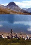 Au lac rond, près du col de la Vanoise, nous faisons la pause casse croûte. C'est tellement beau, comment ne pas s'arrêter là. Certains trouvent l'endroit Paradisiaque, d'autres Idyllique… Il y a même du sable au bord : çà donne envie de rester.