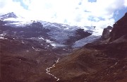 droite, les cascades dégringolent des moraines, au dessous de la calotte glacière
