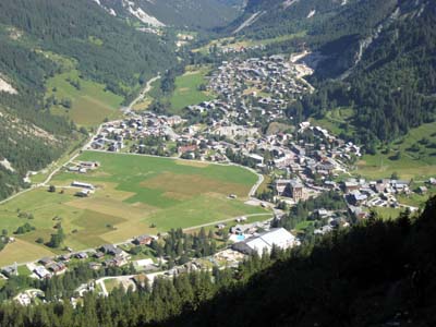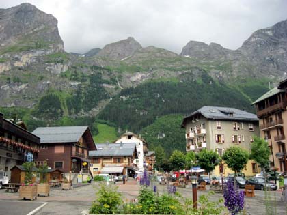 Pralognan la Vanoise avant le départ : dominé par le Grand Marchet, le Petit Marchet, et le Roc de la Valette à l'extrême droite.