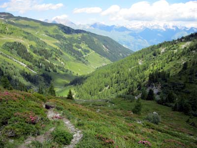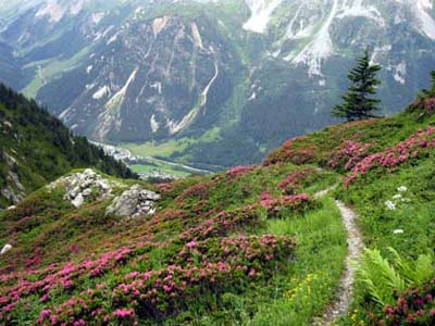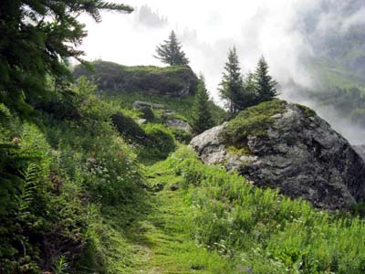 Hier soir l'orage grondait : pluie, tonnerre, et ce matin le ciel est couvert, le plafond de nuages bas, l'air est frais! Je quitte Pralognan (1410m) à 8h45 en suivant la petite route menant au hameau des Granges. De là, le sentier grimpe en sous bois, et en lacets parmi les rhododendrons en fleurs, et les pentes d'herbes.