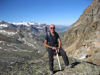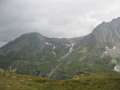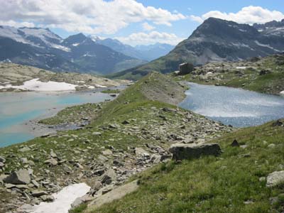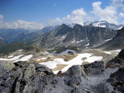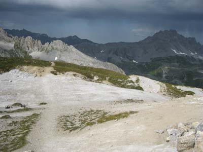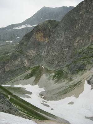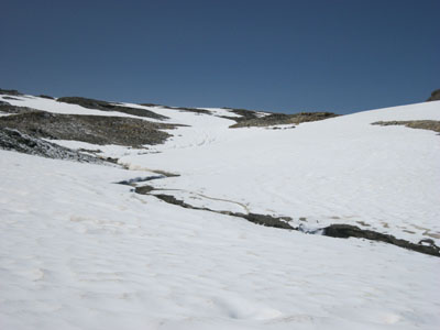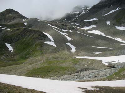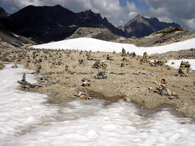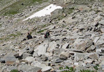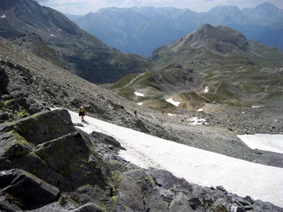 Heureusement des gros cairns sont visibles de loin : par moments on ne voit plus de traces, et il faut grimper dans les pierriers et les schistes, plusieurs gros névés à traverser, dont un en dévers d'où on ne voit pas le bas de la pente...