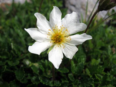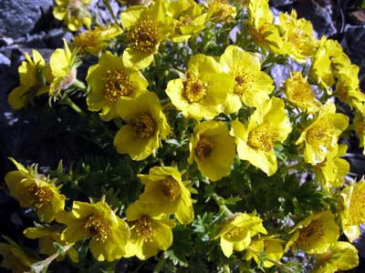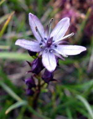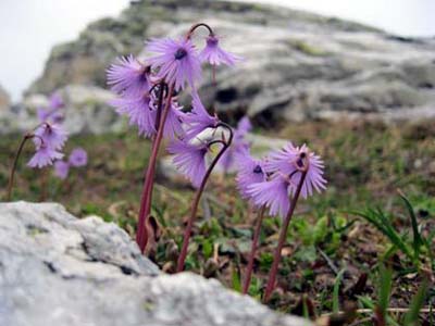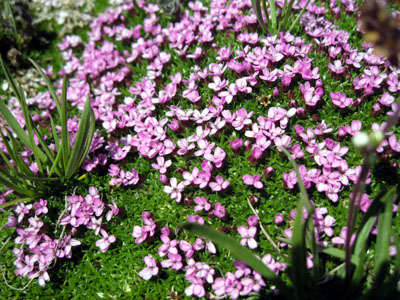 Quelques gouttes de pluie viennent perturber cette montée qui se termine par un sentier caillouteux en arrivant au col de Leschaux à 2564m. Il est 11h45. Ce col est une petite échancrure de roche entre la Pointe de Leschaux, et l'arête menant à l'Aiguille du Bochor. Un névé pentu descend sur le versant nord : je préfère prendre mon piolet en main, d'autant que la neige est gelée! Plus bas je retrouve un bout de sentier dans les schistes, et ensuite encore un gros névé, avant d'attaquer une remontée caillouteuse, et contourner la combe au milieu de talus fleuris. Les soldanelles sont nombreuses, ce qui prouve un printemps tardif. Des gentianes de Koch tapissent les prairies. Il y a plusieurs cascades à traverser, en essayant de ne pas se mouiller les pieds... et des gros éboulis à passer! |