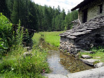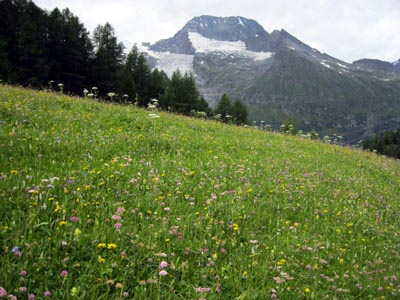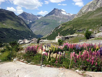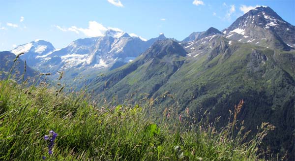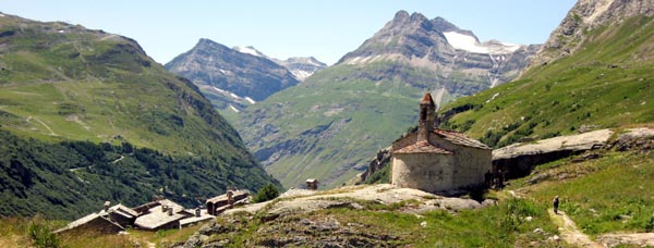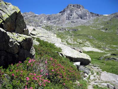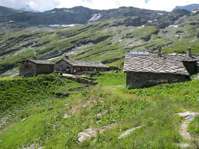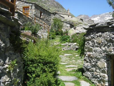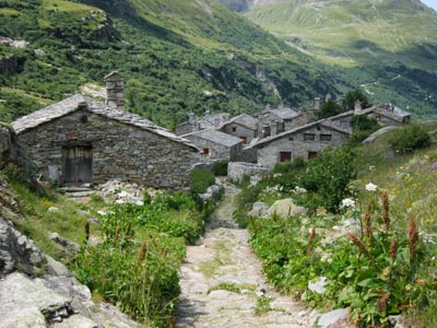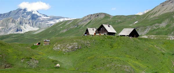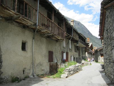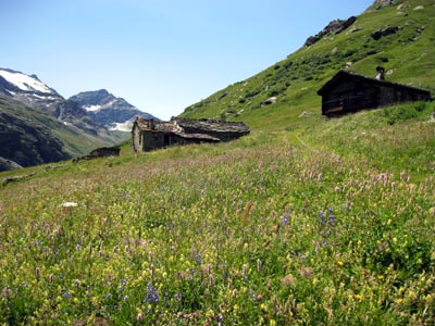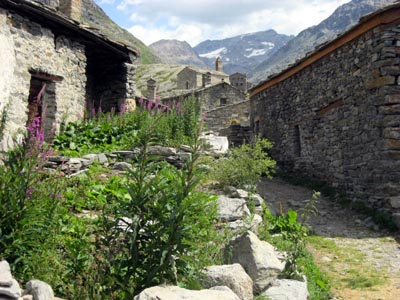 Je rejoins le sentier près du refuge à 10h15. Le temps devient nuageux, et je prends le même chemin qu'hier. Passage au hameau de l'Ecot, et je continue par le sentier fleuri jusqu'à Bonneval sur Arc 1860m : il est tout juste midi et demi...