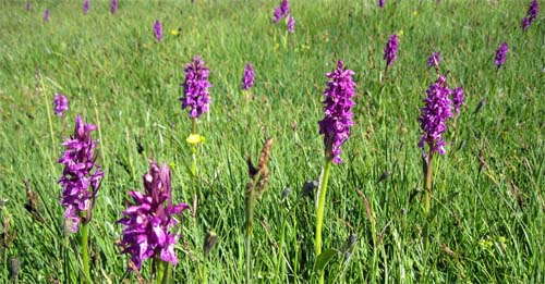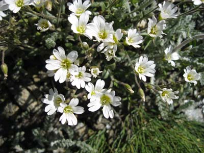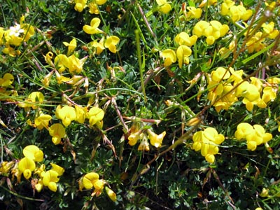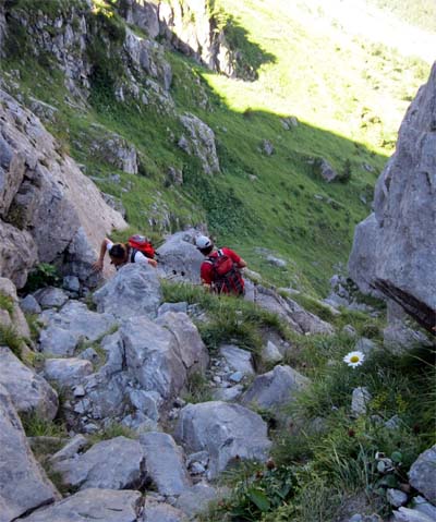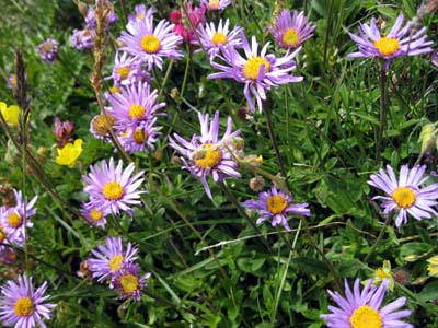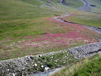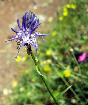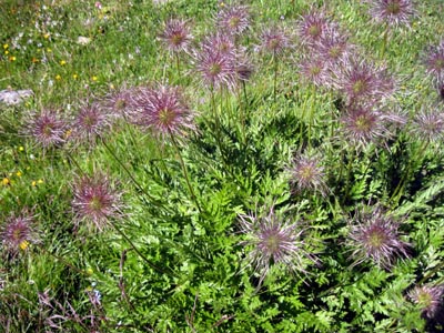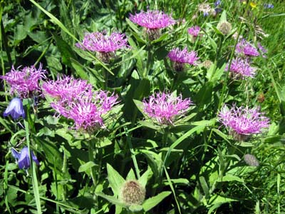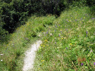 Je retrouve le sentier plus bas dans les pierriers, et la pairie fleurie en continuant la descente.
