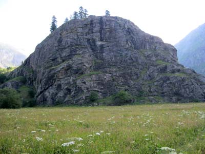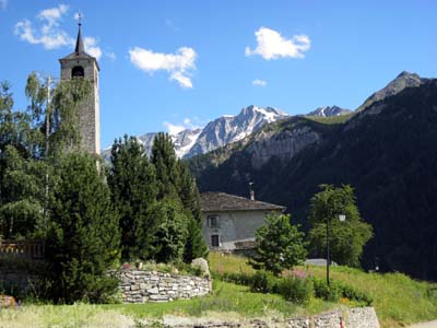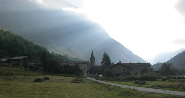 Je pensais monter par le sentier assez ardu, passant par le torrent des Roches, et le chalet du Molard,... mais vu le temps couvert et le brouillard qui se développe, je ne vois pas l'intérêt de faire 600m de D+ pour en redescendre 700 à Bessans... sans avoir de visibilité là-haut! Donc mon plan B est très simple : suivre la vallée par le chemin du "Petit Bonheur". Je quitte Bonneval à 7h40, et à la sortie du village, ce chemin très agréable, tout plat, au milieu des champs, par le Rocher du Château, proche d'un ruisseau, passe par le hameau du Villaron et arrive à Bessans 1700m à 9h30...