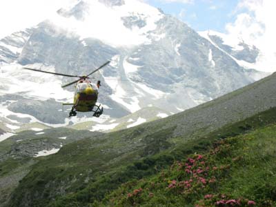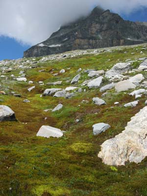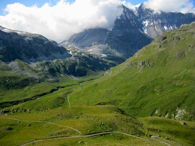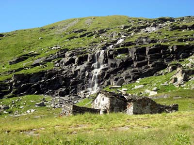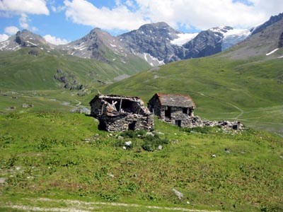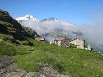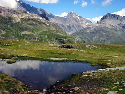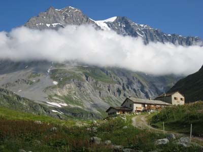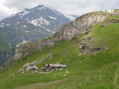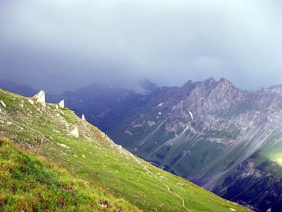 A partir du chalet de Tovet, il n'y a plus de sentier visible, la trace se perd dans les herbes hautes : plus d'indications, plus de balisages. C'est du "hors sentier battu"... La carte Top 25 et indispensable, même s'il y a peu de chance de se perdre! Mais il faut éviter de piétiner les pâturages. Je retrouve un chemin presque plat un peu plus haut. En remontant le long d'un torrent, je passe par les chalets de la Chiaupe, et après une longue montée en lacets, j'arrive au col de la Chiaupe 2492m à midi, entre la Roche de Mio et le sommet de Bellecôte. Il faut passer sous la télécabine qui monte au glacier, mais ne fonctionne pas l'été. De gros nuages ont envahi le ciel, et il souffle un vent froid.