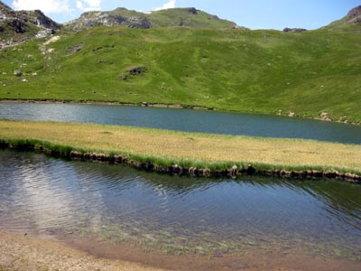 Il fait très beau... Je quitte le refuge des Evettes vers 8h30, pour faire le tour de ce grand cirque glaciaire. Le lac des Evettes, tout comme le lac du Grand Méan un peu plus haut, sont la conséquence du retrait des glaciers : la fonte crée des lacs entourés par les moraines. Sur les pelouses rases coulent les méandres des ruisseaux, qui se déversent en cascade sous le pont de la Reculaz...