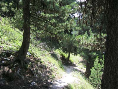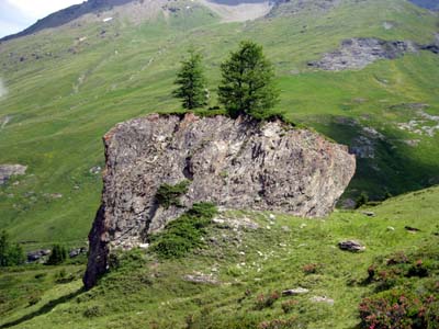 Après le chalet du Barbier, le sentier descend dans une pente caillouteuse et aride et passe au milieu des pins : ambiance et senteur méridionales. Le refuge de l'Aiguille Doran 1835m se trouve dans une vaste clairière jaunie ; il est à peine midi et demie lorsque j'y arrive. L'après midi je monte faire le tour du vallon de l'Orgère par le sentier découverte... Autrefois il s'appelait "sentier écologique", mais n'avait rien de plus écologique que d'autres sentiers du Parc...