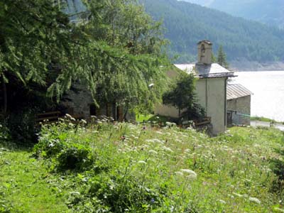 La pente d'herbe mouillée, me conduit sur la route et au hameau de La Reculaz 1800m, au bord du lac du Chevril où se trouve un hôtel "les Séracs". Je n'aurai pas besoin d'aller jusqu'à Val d'Isère!...