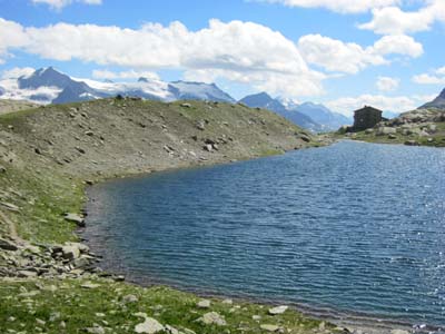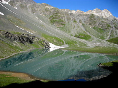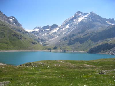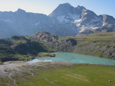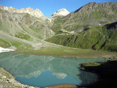 Le ciel est bleu, le soleil brille... Je quitte le refuge de Péclet Polset à 8h. Le sentier passe derrière le refuge et descend vers le très beau lac Blanc.