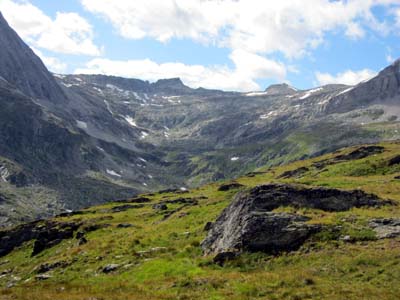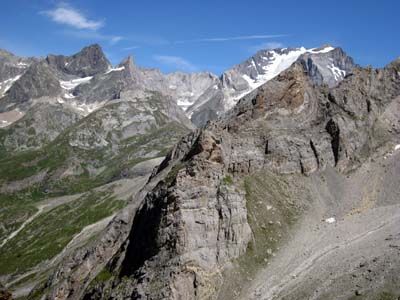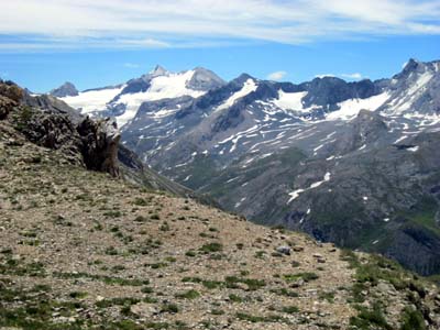 Nouvelle remontée pour arriver au col du Grand Marchet à 2490m, il est 13h15. Petite pause d'un quart d'heure. Très belle vue sur le cirque que je viens de traverser, et en face la Grande Casse est proche...