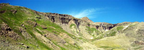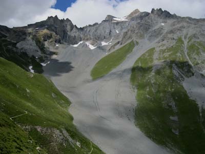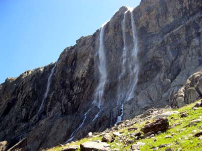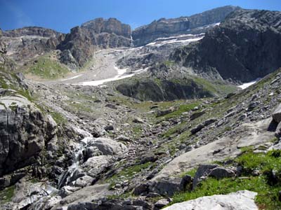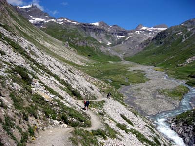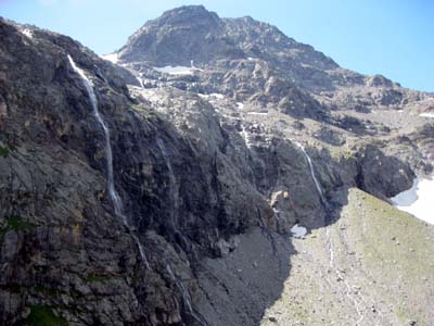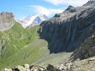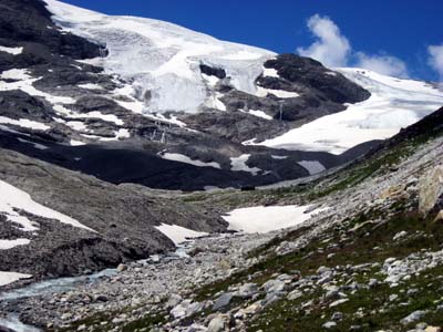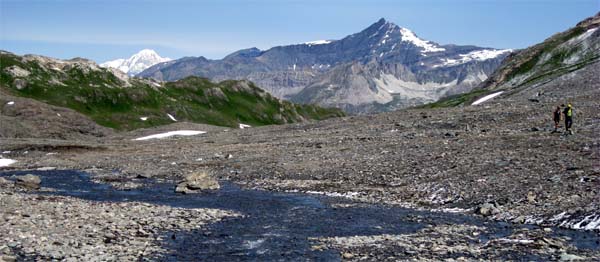 Je retrouve un peu plus d'herbe et de fleurs en arrivant au croisement des chemins, dont l'un va à droite au refuge de la Valette, et l'autre à gauche s'engage dans le cirque du Petit Marchet 2400m. Les cascades chutent du haut des glaciers. Il faut traverser dans les éboulis pour remonter dans un passage donnant accès au cirque du Grand Marchet. Au loin, le col qu'il va falloir atteindre, et plus loin, l'imposant sommet de la Grande Casse. Ici aussi de belles et grandes cascades proviennent des glaciers. Une trace et des cairns contourne le cirque, ce qui a l'avantage d'éviter de descendre dans le fond, mais à plusieurs reprises il faut traverser les torrents bouillonnants sur des blocs instables.
