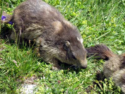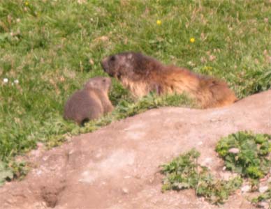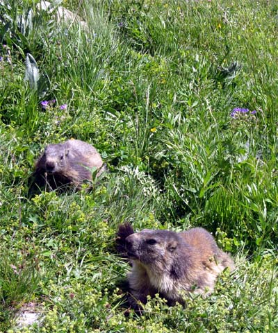 Après une demi heure de pause à l'abri du vent froid, il faut traverser les deux ou trois névés, et continuer dans les pierriers et le sentier qui descend dans le vallon de la Rocheure. Je retrouve petit à petit un peu d'herbe, des fleurs, l'alpage, les vaches, et les marmottes, en arrivant au refuge de la Femma 2340m, à 14h30...