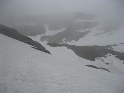 Je pense ne pas être loin du col de la Lose 2957m, mais je ne vois rien, et par ce temps le Grand Paradis doit être totalement caché! Je décide de faire demi tour : les autres feront de même après s'être concertés.