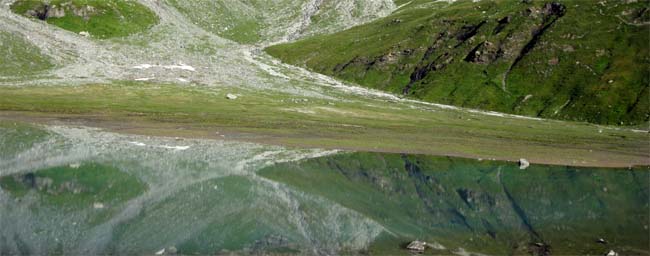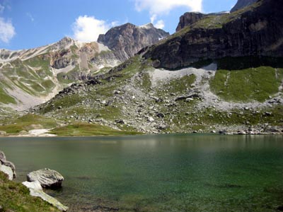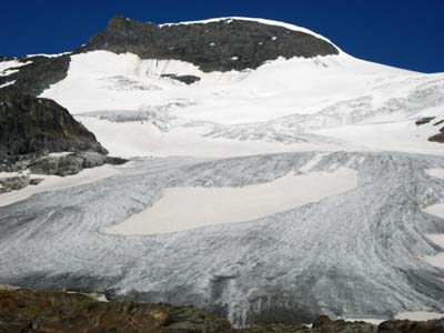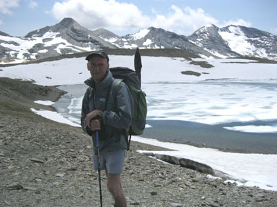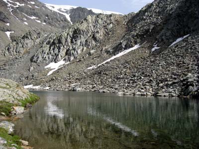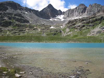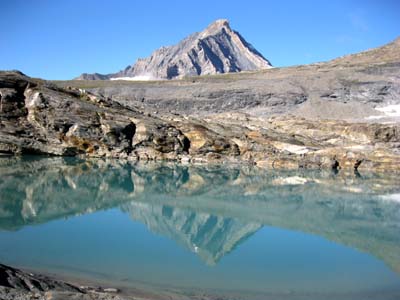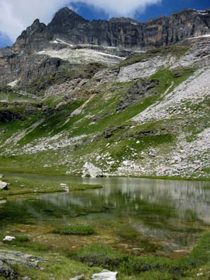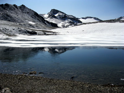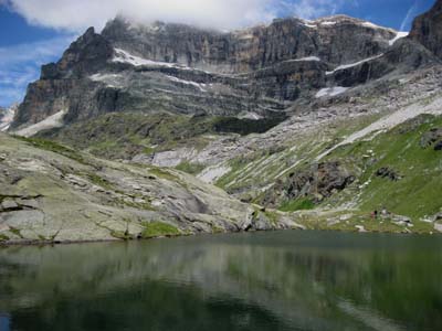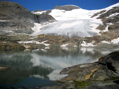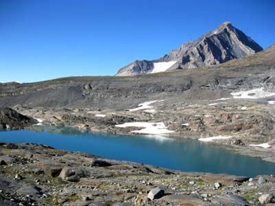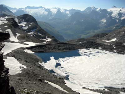 Levé à 6 heures et demie, le petit déjeuner pris. Je sors du refuge sans mon sac à dos, par un temps splendide! La montée est assez rapide en suivant la crête herbeuse, les éboulis, quelques grandes dalles de rochers plats, et un névé. En moins d'une heure je suis au bord du lac de l'Arpont 2670m. Son glacier en net recul perd de l'épaisseur chaque année, et il n'y a encore pas si longtemps la glace était dans l'eau ; maintenant la roche est apparente entre les deux!