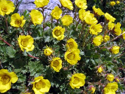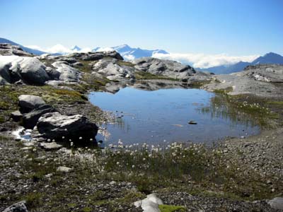 Au fil du temps plusieurs petits lacs de fonte se sont formés dans des creux ou des vasques tout autour du grand lac... Quelques linaigrettes poussent entre rocailles et eau. Magnifique paysage éclairé par un soleil radieux