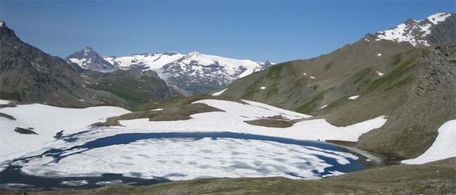 Levé à 7 heures. Beau temps. Petit déjeuner au refuge, que je quitte à 8h15 en remontant par le vallon de l'Orgère. Le sentier grimpe dans la forêt de sapins, en passant aux ruines de l'Estiva, et poursuit en balcon dans les pâturages. Je fais un petit détour jusqu'au lac de la Partie, et une pause. Ensuite je repars ; un peu plus haut il faut suivre le GR® 55, dans les pierriers, les éboulis, et un névé pour arriver au col de Chavière 2796m : longtemps considéré comme le plus haut col franchit par un GR®, mais je ne suis pas sûr que ce soit encore le cas!