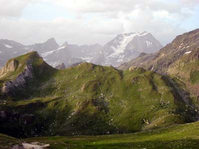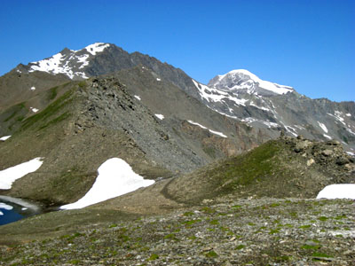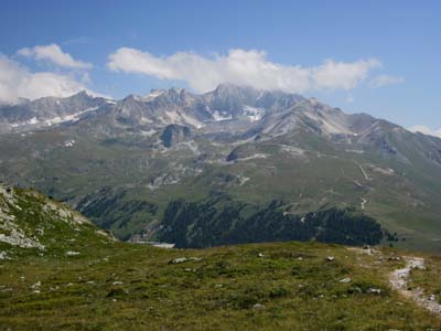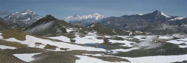 Au col : le Mont Pourri, la Grande Sassière, et le Mont Blanc.