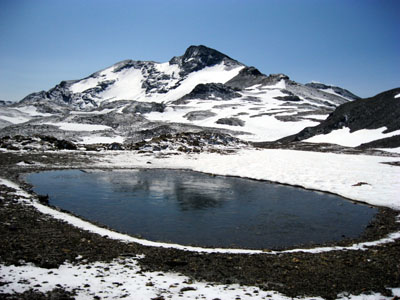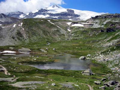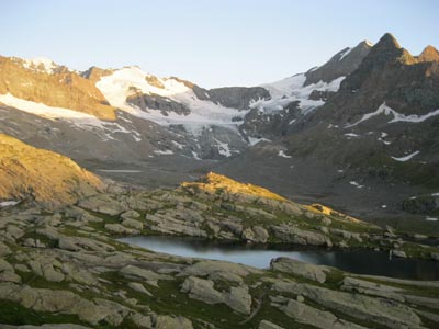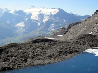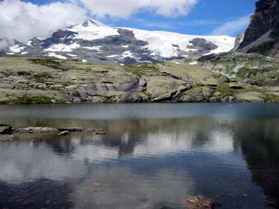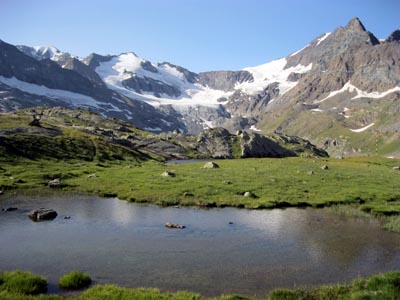 Au dessus du lac de la Rocheure, vue sur les glaciers de la Vanoise, avec la Dent Parachée, et le Dôme de Chasseforêt.