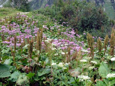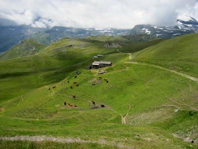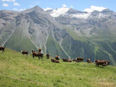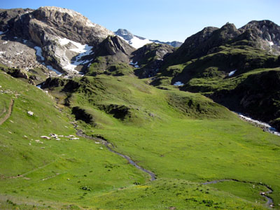 A 13 heures je me remets en marche. En face du hameau, le sentier fleuri monte à l'alpage des Nants, où quelques vaches ruminent tranquillement l'herbe verte : le glacier des Nants a totalement disparu depuis longtemps, et il n'y a pas le moindre névé dans cet ancien cirque glaciaire...