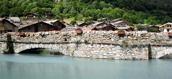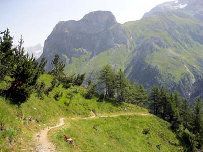Le sentier en lacets serrés atteint la vallée et un barrage sur un petit lac. Il faut maintenant continuer sur un chemin assez plat le long du torrent jusqu'à Champagny le haut 1460m, et le refuge du Bois, Porte du Parc, où j'arrive à 13h.
