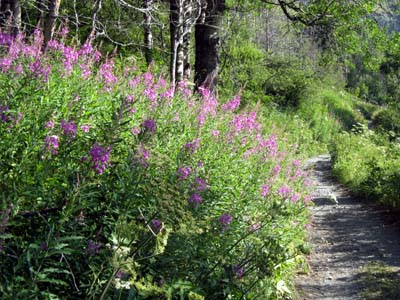 En quelques minutes et un coup de vent, le ciel se dégage, et dans la descente par la forêt Domaniale du Petit Mont Blanc, le soleil fait une généreuse apparition. Le sentier tout d'abord caillouteux, et ensuite fleuri, passe par les pins à crochets, et les mélèzes.