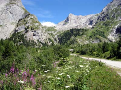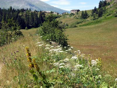 La piste passe par les champs et les près de fauche. Il est 11h50 lorsque j'arrive au hameau du col de la Madeleine. Maintenant fini la marche sur le plat, il va falloir grimper en plein soleil! Quelques sapins font un peu d'ombre, mais très vite le sentier grimpe en lacets dans les pâturages en fleurs! Belles vues sur la vallée et les sommets environnants : la Pointe du Charbonnel, la Pointe de Ronce.