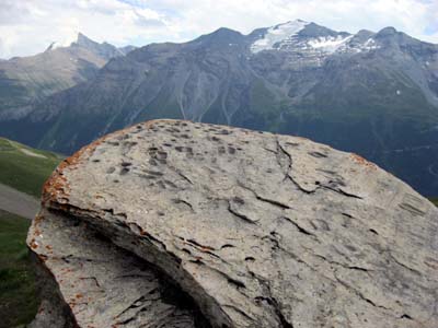 Le petit déj s'étant en partie volatilisé pendant la montée, je fais une petite pause casse-croûte, et à 14h je prends le sentier sans le sac, en direction de la Pierre aux pieds... Une montée d'une heure quinze, assez raide dans la partie terminale, pour atteindre ce site Protohistorique à 2750m, au pied de la combe du Grand Roc Noir.