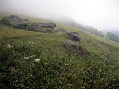 Je suis debout à 6h30. Dehors on ne voit rien, les sommets ont disparu : on ne sait plus si on est vraiment en montagne! Après le petit déjeuner, les deux autres randonneurs et moi, nous partons dans le brouillard et une pluie fine ... Quelques centaines de mètres plus loin, nous devons traverser un torrent bouillonnant sur une planche mouillée. Le sentier herbeux en balcon est trempé, et la vallée cachée dans la brume. Avant de passer près du refuge du Cuchet, les deux seniors décident de faire une pause dans ce refuge non gardé mais ouvert. Nous nous retrouverons au Plan du Lac. Je préfère continuer! mouillé pour mouillé, si je m'arrête j'aurai du mal à repartir! D'ailleurs mes pieds commencent à être trempés...