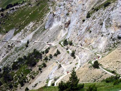 Ensuite il faut redescendre par le sentier caillouteux et terreux en zigzag jusque vers 2200m. Quelques touffes d'herbes sèches, et des pins à crochets : le sud de la Vanoise a une végétation méridionale.