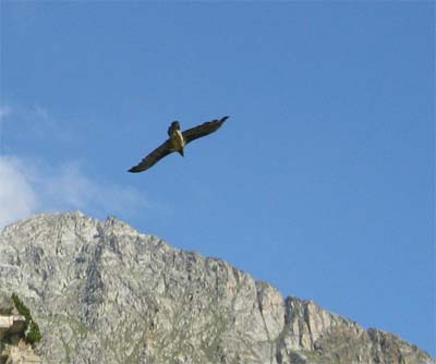 Je continue la descente le long d'un torrent, par le Grand Vallon et en suivant les cairns. J'arrive dans les pâturages où se trouve un énorme troupeau de brebis, et j'ai même l'avantage de faire connaissance avec deux gros Patous... Quand il y a ces chiens dans un troupeau, l'important est de les ignorer. Il ne faut surtout pas se diriger vers les brebis, même si elles sont sur le sentier! Je m'éloigne en contournant le troupeau, quitte à faire du chemin et des dénivelées en plus... Les chiens aboient de loin ; je me suis retourné pour les regarder, eh bien l'un des deux Patous a couru en aboyant jusque derrière moi... j'ai continué à marcher normalement, sans lui jeter un regard! Il ne faut surtout pas se précipiter ; il est reparti vers son troupeau. Il voulait me faire remarquer que je n'ai rien à faire au milieu de ses brebis, surtout avec un bâton et un piolet sur le sac ; je dois filer en m'éloignant le plus possible!