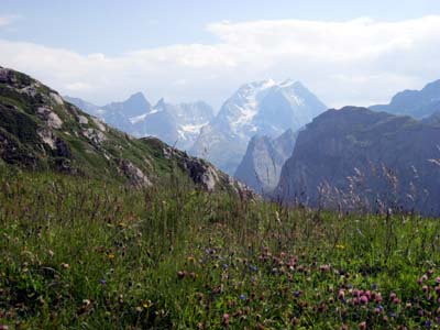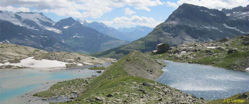Descente dans un ancien verrou glaciaire pour atteindre le refuge du Fond des Fours à 2537m, et il n'est que midi et demi... mais trop tard pour aller plus loin. D'ailleurs ici c'est très bien : on est au milieu de la verdure, des fleurs et des marmottes ; vue sur la Grande Sassière, le Mont Blanc au loin, et devant la célèbre face de Bellevarde au pied de laquelle on devine Val d'Isère. Derrière nous, le sommet de Méan-Martin apparaît encore.