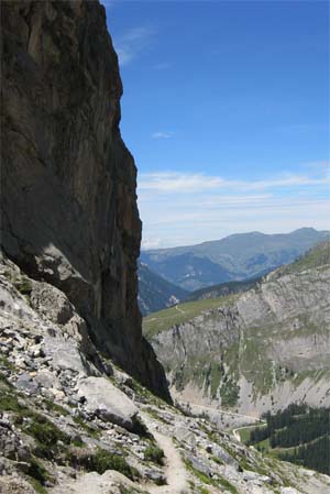 Retour au refuge par le même chemin... Entre temps tout le monde est parti! Je récupère mon sac à dos. Il est 10 heures un quart, il commence à faire chaud, et je me mets en route! Le chemin descend et passe devant un oratoire, ensuite aux chalets Le Mont, puis remonte vers Montafia. A partir de là le sentier balcon offre une vue dégagée sur toute la vallée de Maurienne, malgré les nuages qui se sont formés au fil des heures... Le paysage aussi a changé de physionomie : versant sud oblige! le terrain est sec, caillouteux. Le roc des Corneilles mérite bien son nom, au dessus des parois rocheuses.
