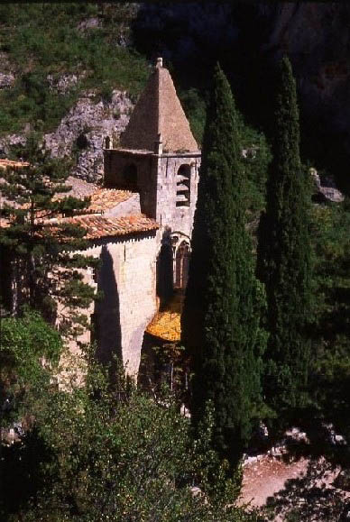 Le rocher de plus de 100 m de haut et le petit sentier grimpant jusqu'à la chapelle de la vierge, visible de loin. Le Verdon passe juste au pied de ce rocher...
