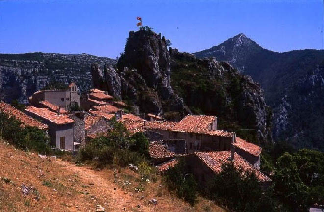 Plus bas, un gros rocher avec deux drapeaux, quelques toits de tuiles roses. Un peu plus loin, l'énorme faille très impressionnante vue d'ici :