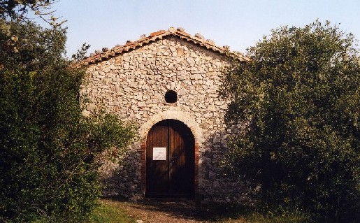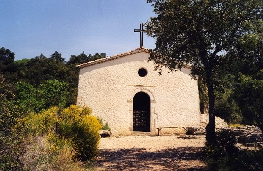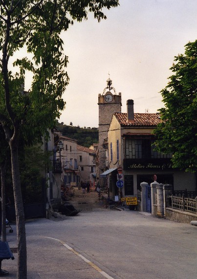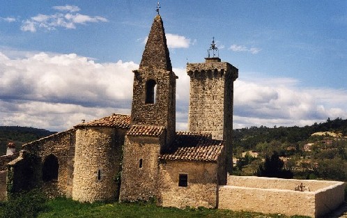 La Chapelle Ste Maxime apparaît derrière une curieuse Tour en ruine ; les habitants de Quinson viennent en pèlerinage ici chaque année à la mi mai. |