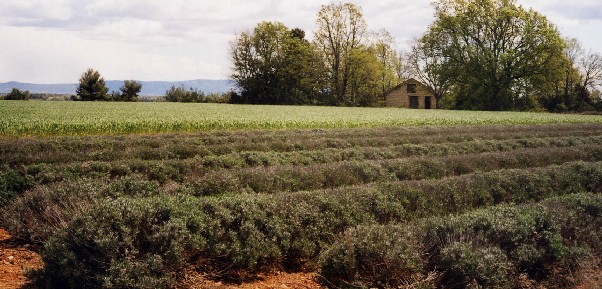 Le temps de faire une courte pause casse croûte, mais sans escargots! et nouvelle montée dans les bois. Le sentier suit une ligne de crête, assez agréable. L’altitude est d’environ 500 mètres. Le cheminement est pratiquement au même niveau. Au bout d’un moment on rejoint la route reliant Valensole, (célèbre pour ses lavandes) et Allemagne en Provence. Il faut suivre cette route jusqu'à un grand virage, et retrouver le sentier passant par les cultures et les lavandes de nouveau en plein vent.