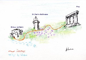 Je retrouve la forêt, des chênes blancs et verts, on se sent un peu abrité ! Grande descente vers St Martin de Bromes, village plein de mystères avec ces vieilles maisons aux porches, et portes gravées de bien étranges inscriptions.