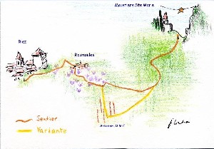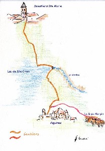 Pour plus de précision, je recommande les cartes au 25 millième de toute la région. En effet, certains itinéraires empruntés ci dessous ne sont pas balisés, et les indications sont rares, même sur les parties de GR traversés. Les marques GR®, GRP®, les signes de balisage correspondants (blanc/rouge et jaune/rouge), et PR® sont des marques déposées par la Fédération Française de la randonnée pédestre. Autorisation de reproduction 2008.